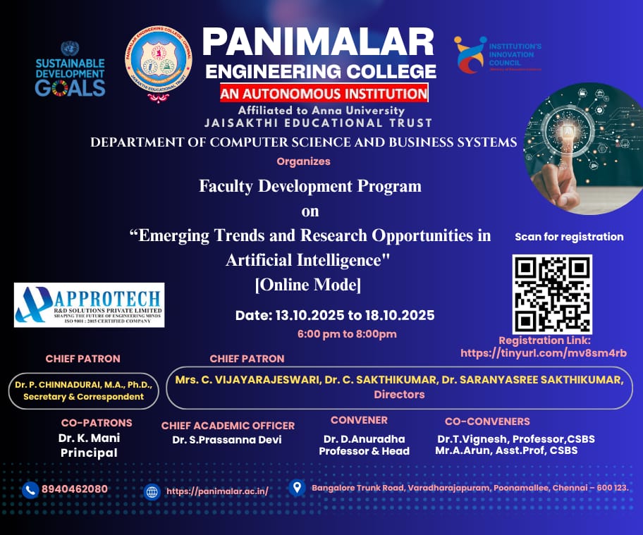 FDP on Artificial Intelligence organized by Approtech R&D Solutions Pvt. Ltd. at Panimalar Engineering College.