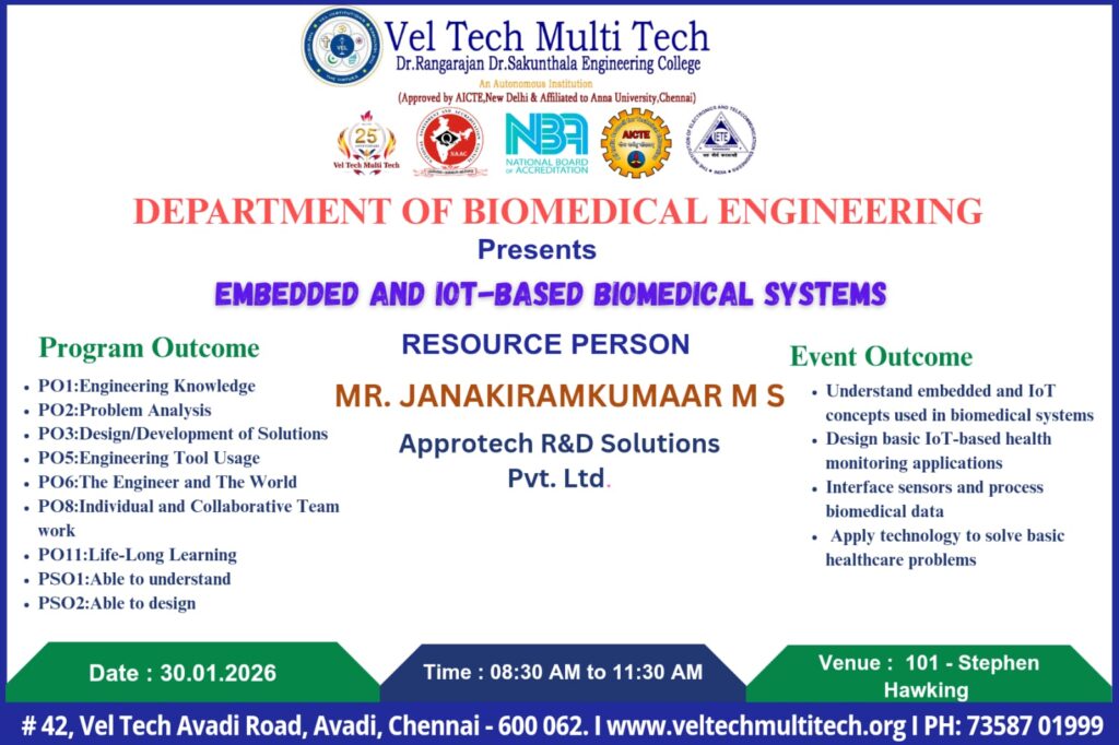 Guest Lecture on Embedded & IoT Based Biomedical Systems for the students of the Department of Biomedical Engineering, Veltech Multitech Engineering College.