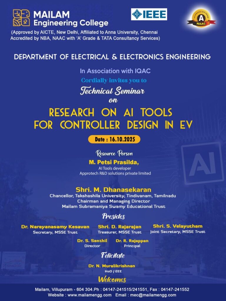 Seminar on Research on AI Tools for Controller Design in Electric Vehicles at Mailam Engineering College