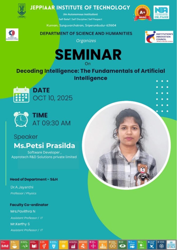 We are delighted to announce that Approtech R&D Solutions Pvt. Ltd. is conducting a seminar on “The Fundamentals of AI” at Jeppiaar Institute of Technology.